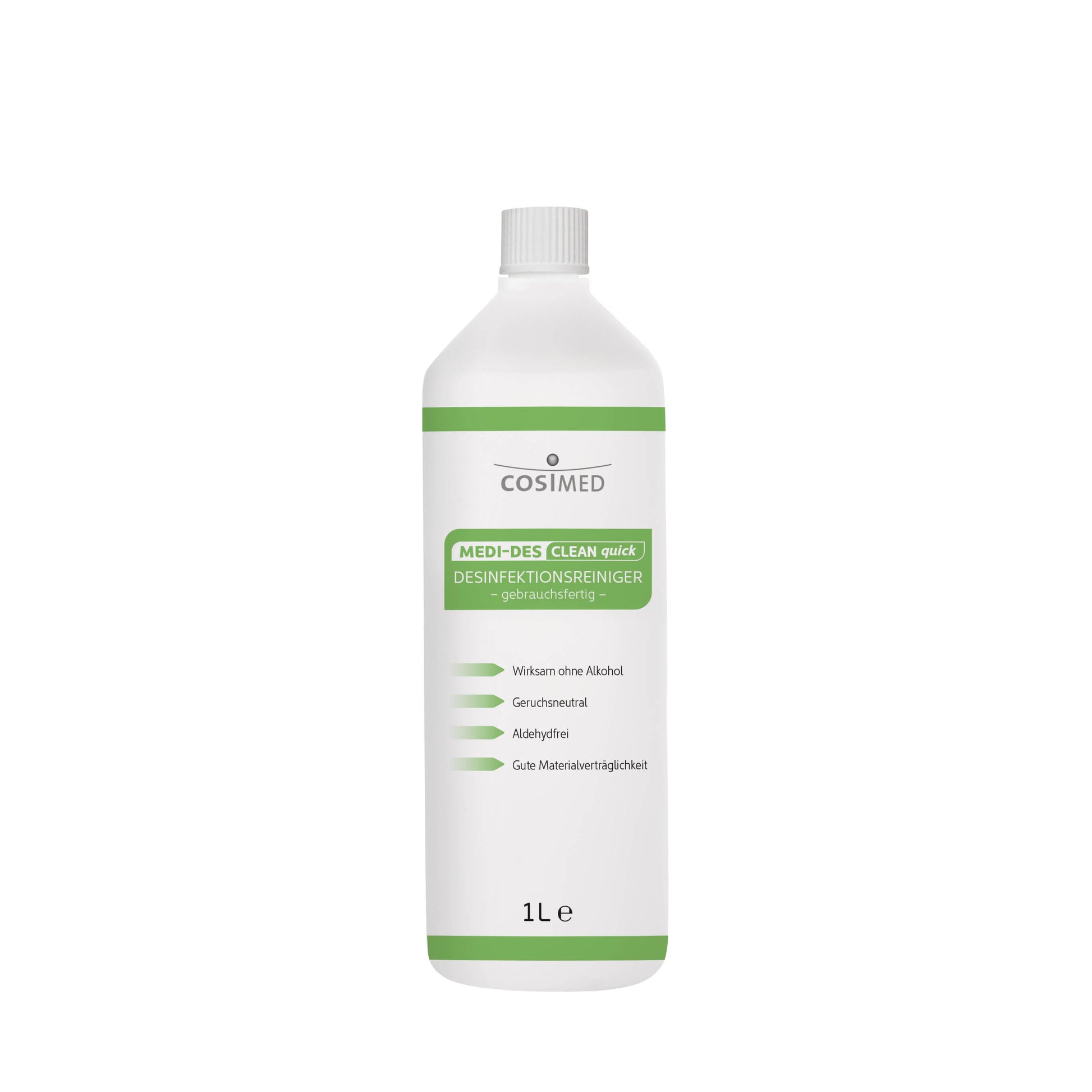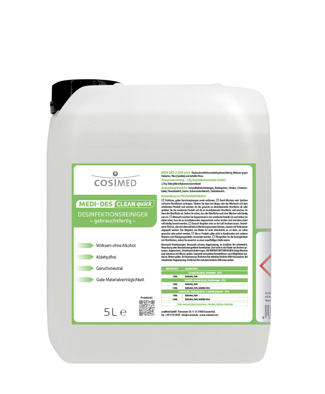 cosiMed MEDI-DES CLEAN Quick ist ein gebrauchsfertiger Desinfektionsreiniger, der Reinigung und Desinfektion in einem Schritt vereint. Er eignet sich ideal für abwaschbare Flächen in medizinischen Einrichtungen, Schulen, Kindergärten, Fitnessstudios, Gastronomie, Veterinär- und Sanitärbereichen.