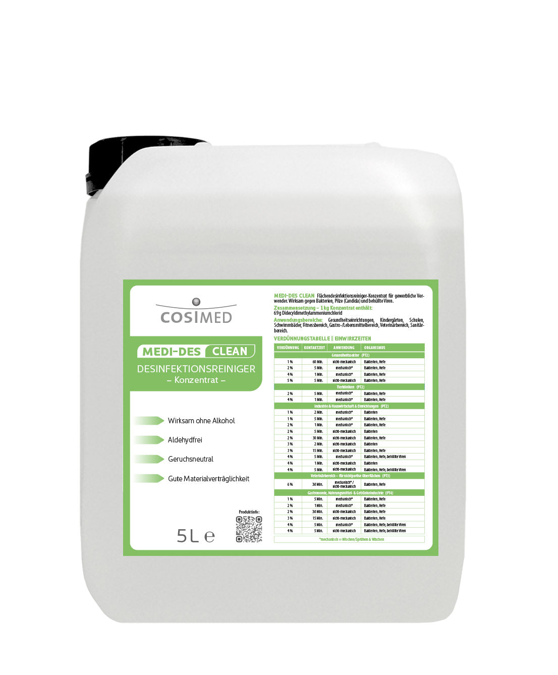 cosiMed MEDI-DES CLEAN ist ein hochwirksames, alkoholfreies Desinfektionsreiniger-Konzentrat zur professionellen Reinigung und Desinfektion abwaschbarer Flächen. Es eignet sich ideal für den Einsatz in medizinischen Einrichtungen, Kindergärten, Schulen, Fitnessstudios, Gastronomie, Veterinär- und Sanitärbereichen.