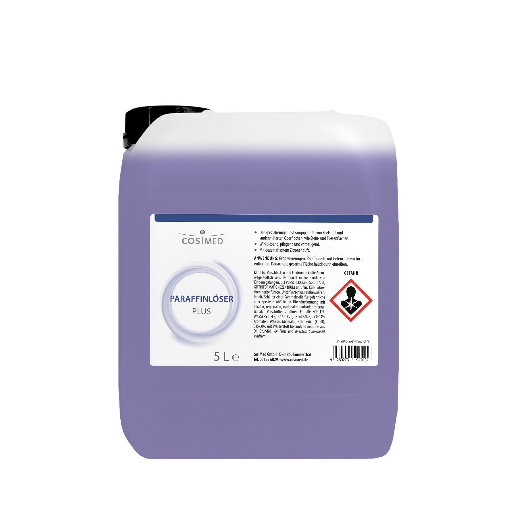 Der cosiMed Paraffinlöser plus ist ein leistungsstarker Spezialreiniger zur Entfernung von Fangoparaffinspritzern auf Edelstahloberflächen, Stein- und Fliesenflächen. Besonders geeignet für die Reinigung von Fangoparaffin-Erwärmungsgeräten, überzeugt er durch seine effektive Reinigungsleistung und den dezent frischen Zitronenduft.